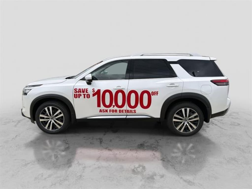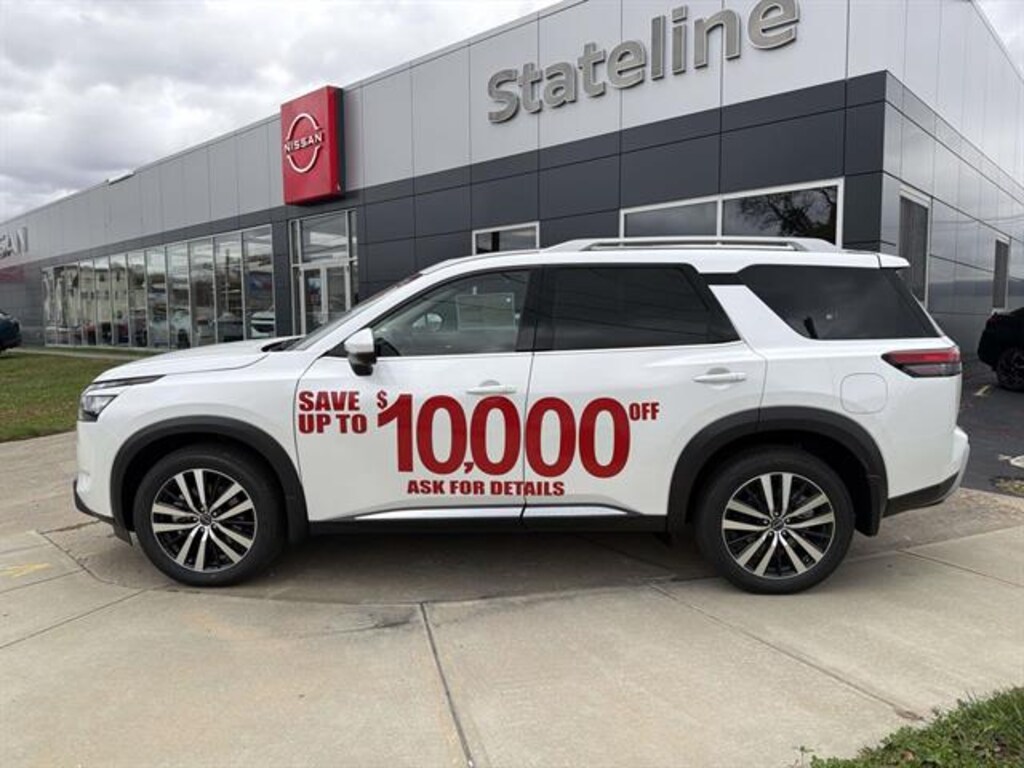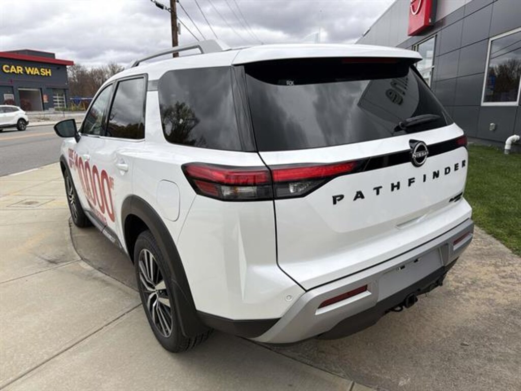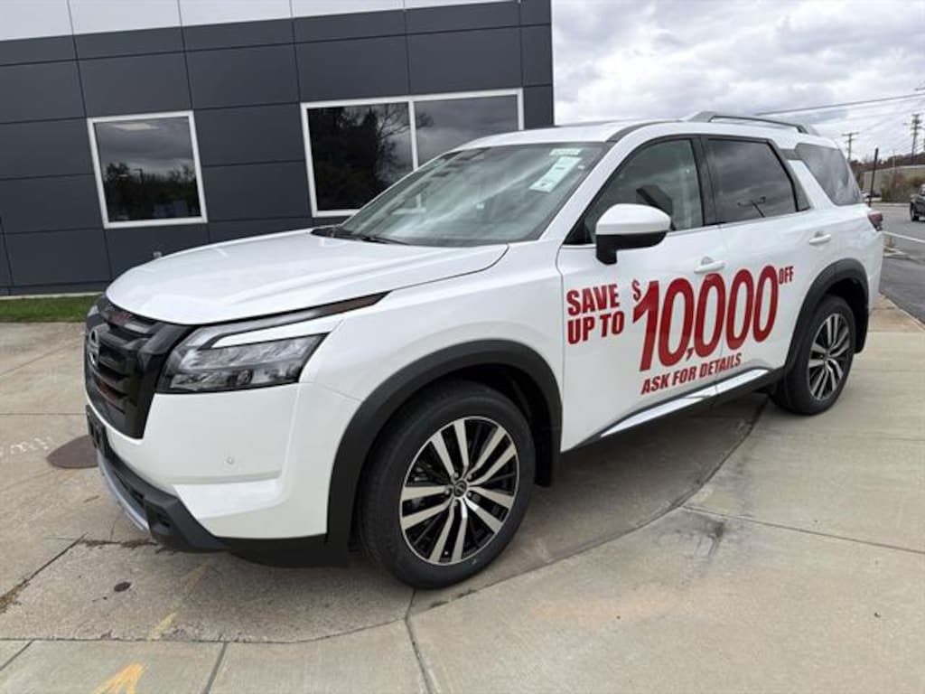 Discover luxury and performance in this stunning White 2025 Nissan Pathfinder Platinum 4WD, with just 5 miles on the odometer. Powered by a robust 3.5L V6 engine delivering 284hp and paired with a 9-speed shiftable automatic transmission, this Pathfinder is ready for any adventure. Enjoy the confidence of intelligent 4WD with driver-selectable modes and advanced safety features like ProPILOT Assist, Blind Spot Warning, Automatic Emergency Braking, and an Intelligent Around View Monitor. The spacious interior seats up to 8 in premium semi-aniline leather, with heated and ventilated front seats, heated rear seats, tri-zone automatic climate control, and a panoramic sunroof. Stay connected with NissanConnect navigation, wireless Apple CarPlay/Android Auto, a 13-speaker Bose audio system, wireless charging, and mobile hotspot capability. Convenience abounds with a power liftgate, remote start, front and rear parking sensors, and memory settings for the driver's seat, mirrors, and steering wheel. This Pathfinder comes equipped with 20-inch alloy wheels, roof rails, and a Class III tow package, making it perfect for families or weekend getaways.